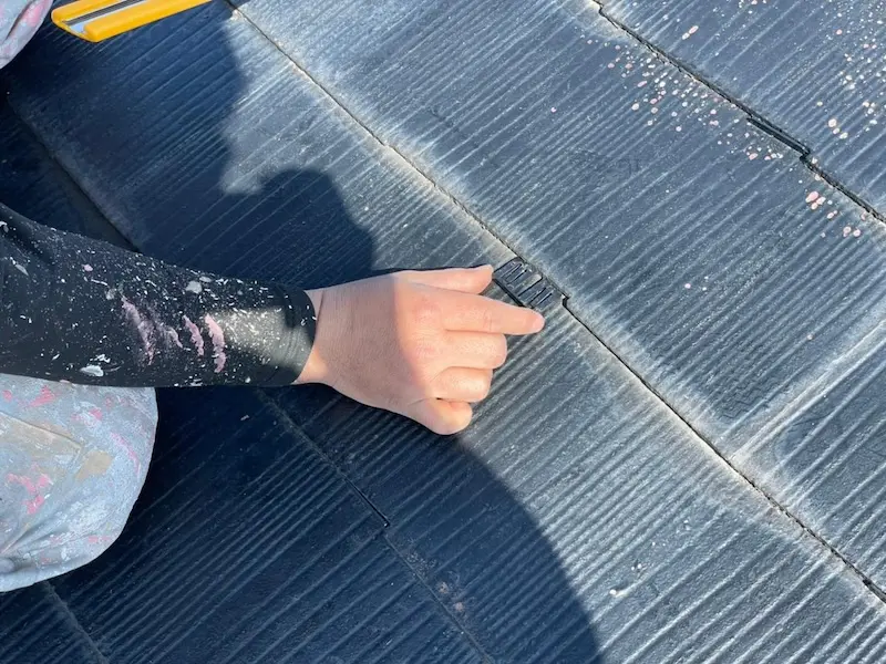 既存屋根は塗膜で塞がっていたため、塗装前に縁切り補修をしました。