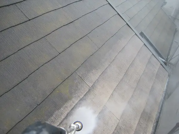 写真は屋根の高圧洗浄の様子です。