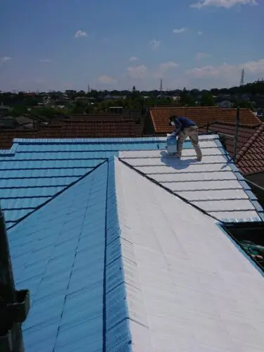 上記の写真を見ていただくと白い塗料で塗られている屋根材があるのがわかるかと思います。この白い塗料は下塗り材で塗料と下地の密着性を良くさせる役割があります。外壁塗装と同様に屋根の塗装も下塗りを行ってから仕上げの塗装をしていく工程で進んでいきます。