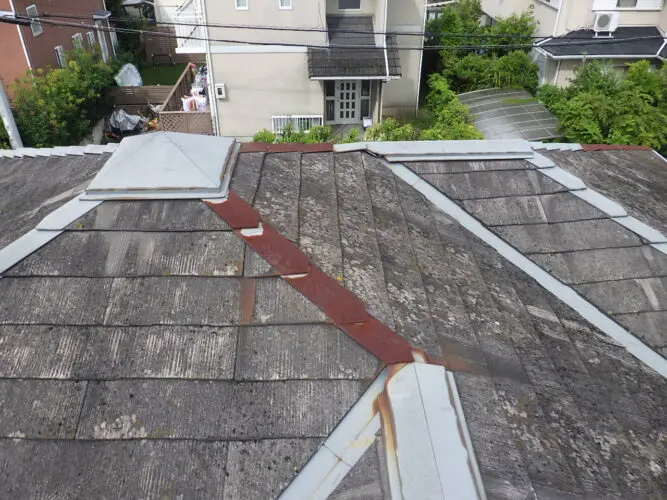 屋根の傾斜側の棟を隅棟といって、そこのところに取り付けてある板金が隅棟板金です。こちらも風で飛ばされてしまうことがあるため劣化症状には注意しましょう。今回見ていただいている現場の板金は塗装の劣化による色褪せと錆が発生しています。