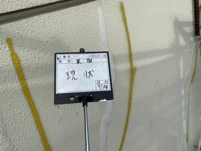 今回の現場レポートは大阪府八尾市のマンション外装工事の続きをお伝えします。行いました作業は外壁の下塗り塗装です。上記の写真は施工前の外壁で、塗膜の劣化により汚れが付着している状態です。塗料の原料は樹脂なため静電気を帯び、年数が経つことで少しずつ埃などが付着し、建物を汚していきます。