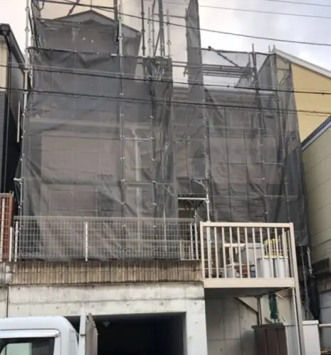 足場の部材は重量があり、組み立てる際は高所作業となりますので十分に安全を確保して作業を行わなければいけません。足場設置後は近隣の方にご迷惑をかけないようにメッシュシートを張って飛散防止をします。