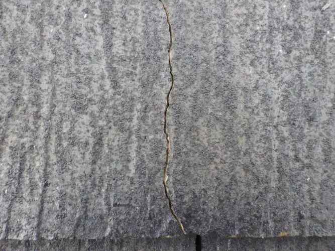 既存のスレートにはひび割れが起きていました。今回屋根の塗装を行っていきますので、スレートのひび割れは塗装前にコーキングを打って補修していきます。屋根材の割れは雨漏りの直接的な原因にはなりませんが、水の侵入が増えることでルーフィングの劣化を早めてしまう恐れがありますので注意しなければいけません。