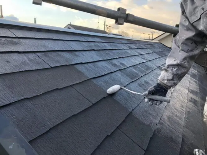 今回の現場レポートは屋根の下塗り作業をご紹介します。下塗りはケレンなどの下地処理を終えた後に行う工程です。下塗りの段階では選んでいただいた色の塗料を塗るのではなく、下地との密着性を高めるシーラーや素地調整剤のフィラーを塗布していきます。シーラーやフィラーを塗ることで下地と塗料がより密着して剥がれにくくなりますのでとても重要な工程となります。