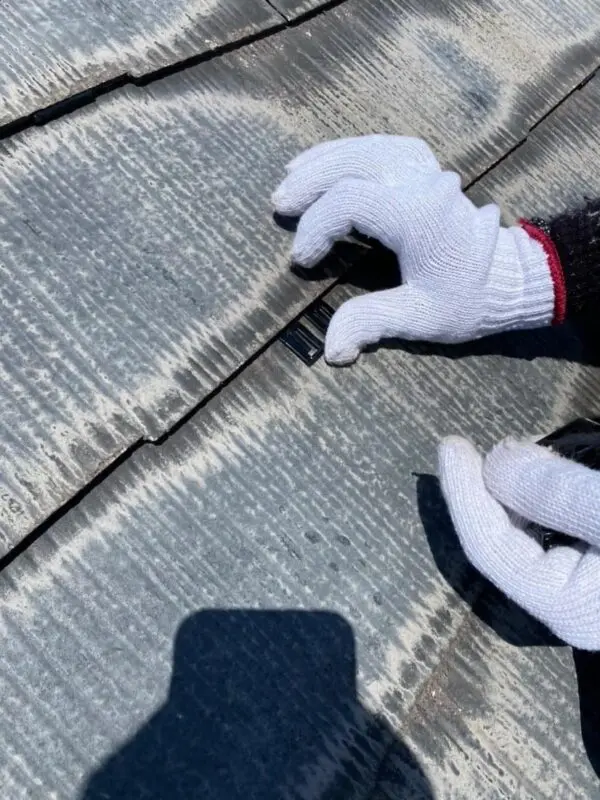 先ずは塗装に入る前にタスペーサーという道具を画像のように屋根材の隙間に設置していきます。