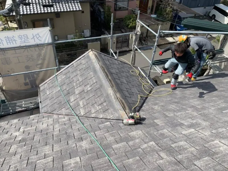 大阪府河内長野市の屋根カバー工事にて既存棟板金の取り外しを行いました。