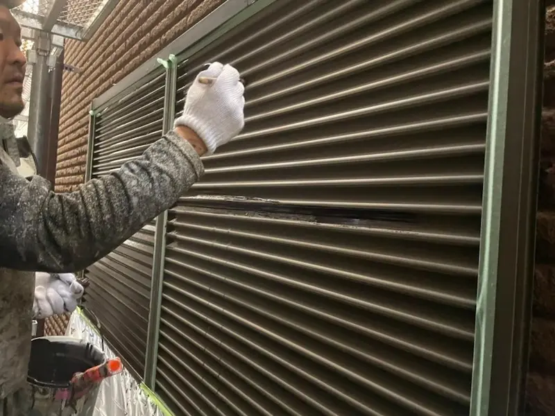 雨戸の枠のところはアルミですので塗装しませんが、正面の波板部分は鋼板が使われていて経年劣化で色褪せてくるため、定期的に塗装が必要です。