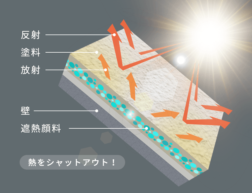 遮熱塗料に含まれる遮熱顔料が、太陽光の波長のうち温度上昇の原因となる近赤外線を効果的に反射し、室内の温度上昇を抑えます。