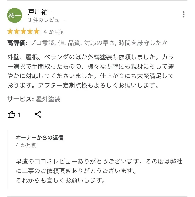 堺市南区の外壁塗装後のお客様の声(Google口コミより)
